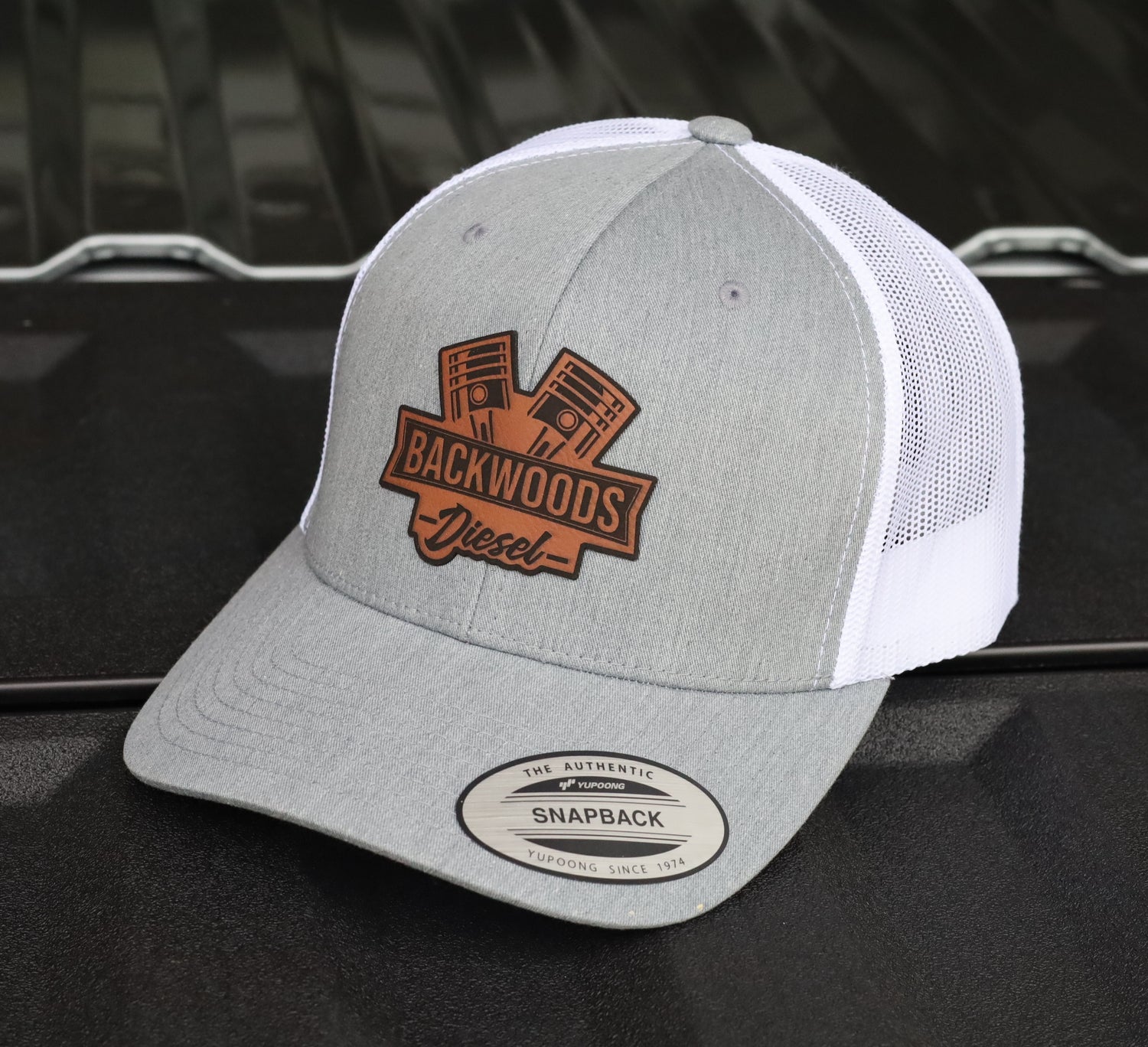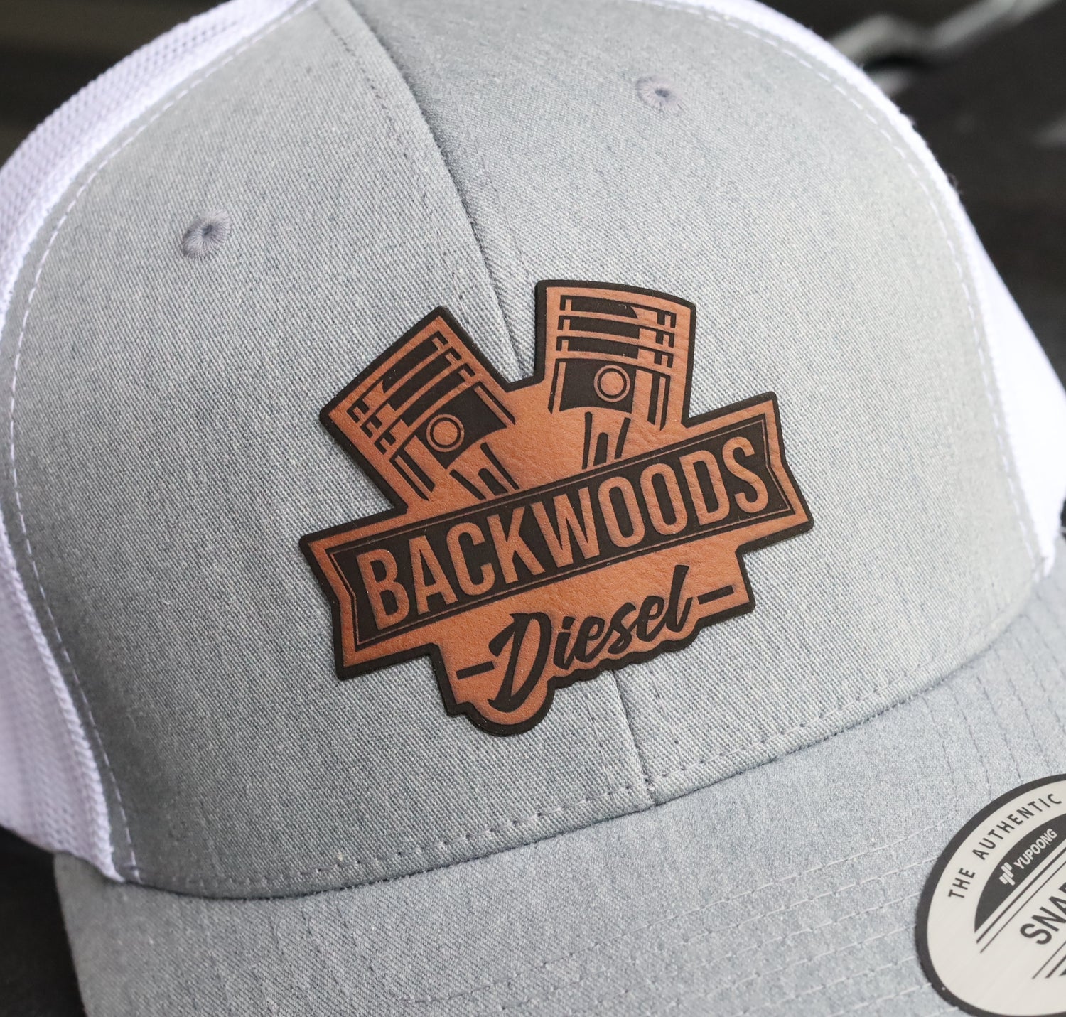 BackWoods Diesel Trucker Hat – Heather Gray & White Snapback with Leather Patch is backordered and will ship as soon as it is back in stock.