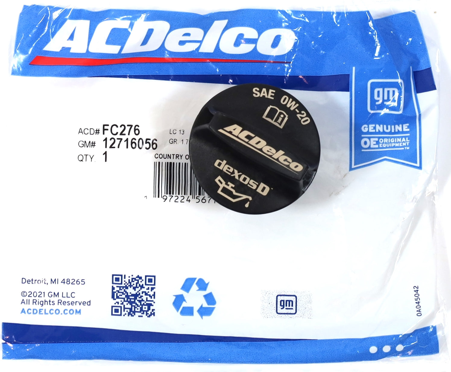 Replace your missing or worn engine oil cap with this Genuine GM ACDelco FC276 / 12716056 DexosD SAE 0W-20 Oil Cap, engineered specifically for 2020–2025 Chevrolet Silverado 1500, GMC Sierra 1500, and 2021+ GM SUVs equipped with the LM2 or LZ0 3.0L Duramax diesel engines.
