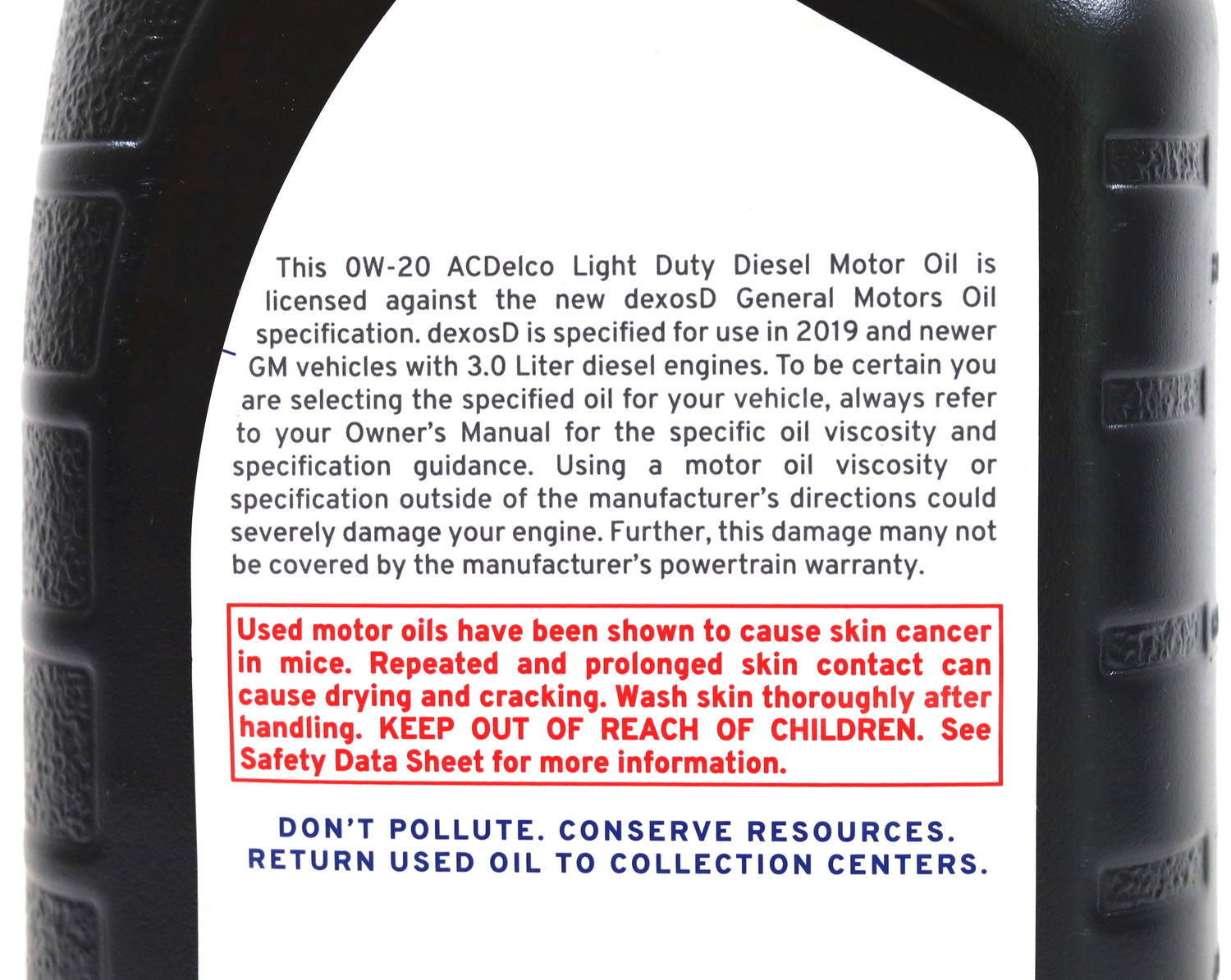 What’s Included: (1) Quart of ACDelco DexosD 0W-20 Light Duty Diesel Engine Oil