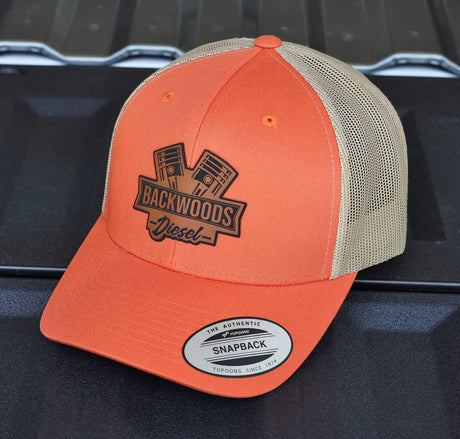BackWoods Diesel Trucker Hat – Rustic Orange & Khaki Snapback with Leather Patch